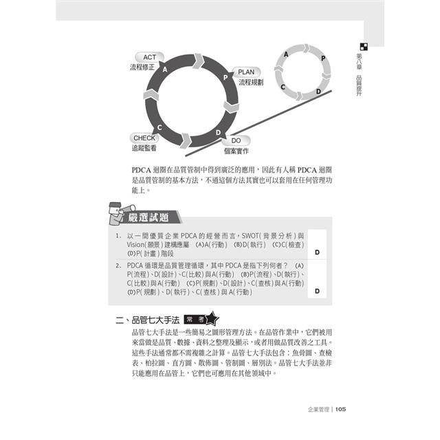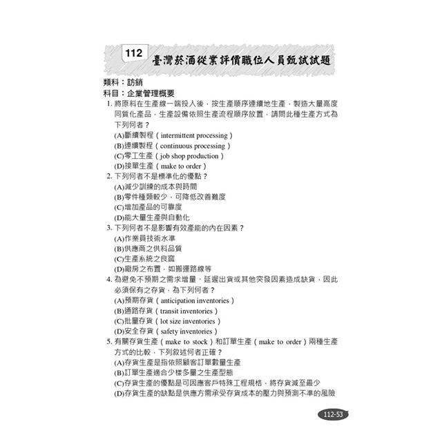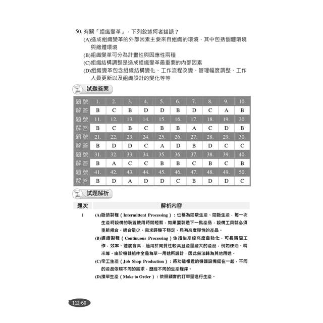 書末收錄112年相關國營事業招考試題共7份,100%題題詳解。讀者可透過演練考古題來檢驗自身實力,不明白處可研讀解析進行強化,熟能生巧,當練習到對題目有題感時,代表對答題的直覺越來越精準,即便非企管相關科系畢業的一般考生,也能輕鬆自學。