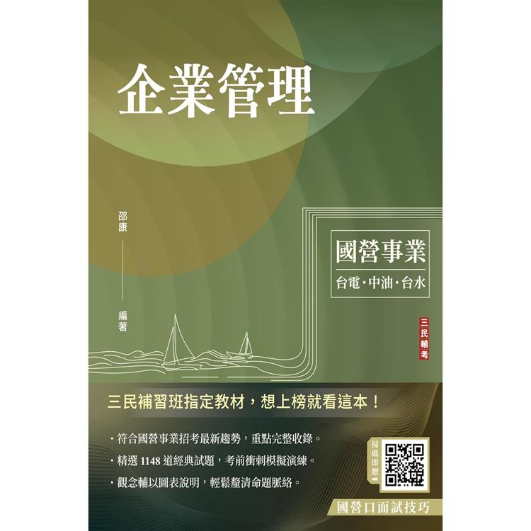 這本全新編撰的《企業管理》(9786267353899),由教學經驗逾三十年的三民輔考名師邵康老師編著,特別針對報考國營事業的考生需求,將歷年出題的趨勢與常考題型做全方位的整合與歸納,化繁為簡,讓內容更易讀好吸收,再搭配歷屆試題做演練,精進實戰經驗,增強作答實力。
