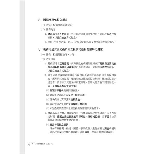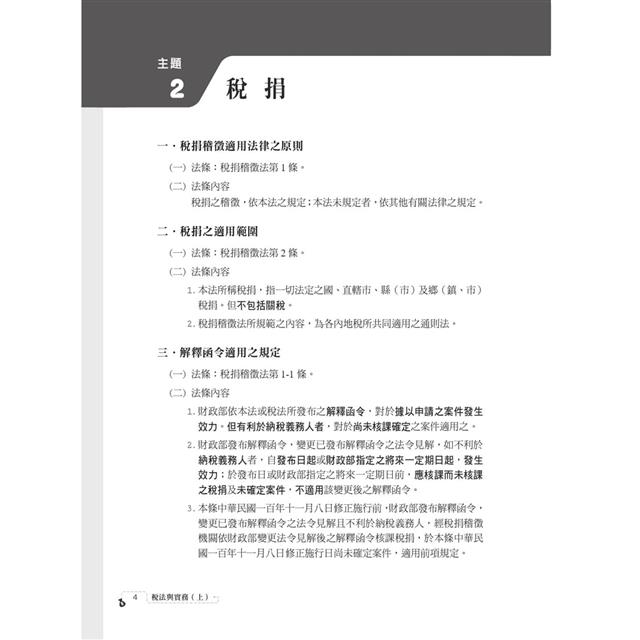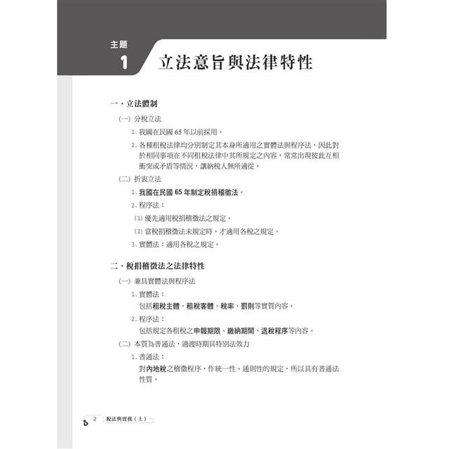 這本《稅法與實務(上)》依命題大綱收錄稅捐稽徵法、遺產及贈與稅法、加值型及非加值型營業稅、營利事業所得稅、反避稅之四大天王與租稅優惠措施共五大章39個主題,深入淺出,即便非法律系的一般讀者也能在作者的諄諄引導下循序漸進,厚積薄發。再配合依最新修正條文編著之重點,充份掌握修法動態,把握考試致勝關鍵!