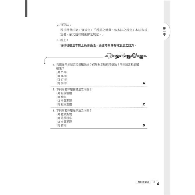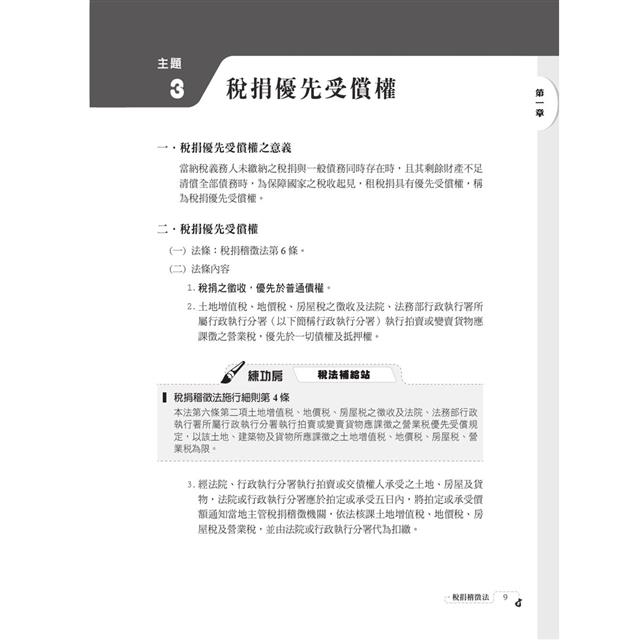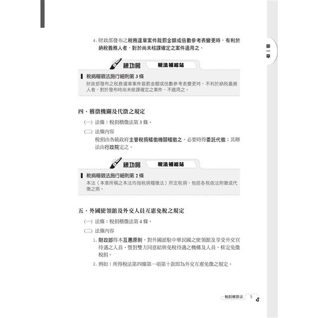 作者於內文中特別設計「練功房」元件,提供稅法補給站突顯稅務細節。重要段落附有「武林秘笈」做為研讀小叮嚀,作者的提醒有如醍醐灌頂般打通考生任督二脈,易混淆的觀念毫不費力就釐清了。