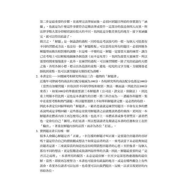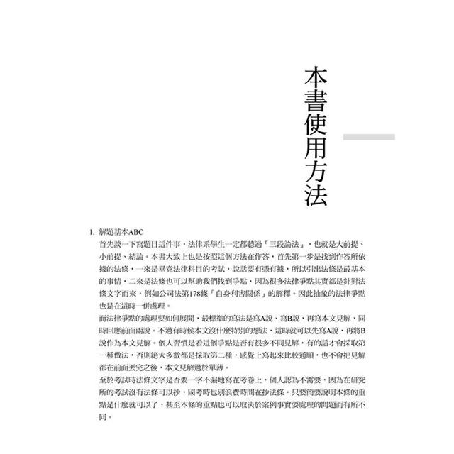 在結束當考生的日子後,因緣際會之下受到新學林副總編的推薦以及學稔主編的邀請,給予我寫書的機會,當時作為商法組的學生,覺得在備考的路上,商法三科的佔分不多,卻因為缺乏一本整合的解題書,若想要練習商法的解題,就必須花上三本書的功夫,導致很多考生「以大局為重」,割捨商法解題書這一塊,因此才有這本書的誕生。