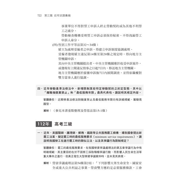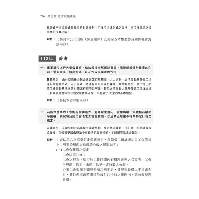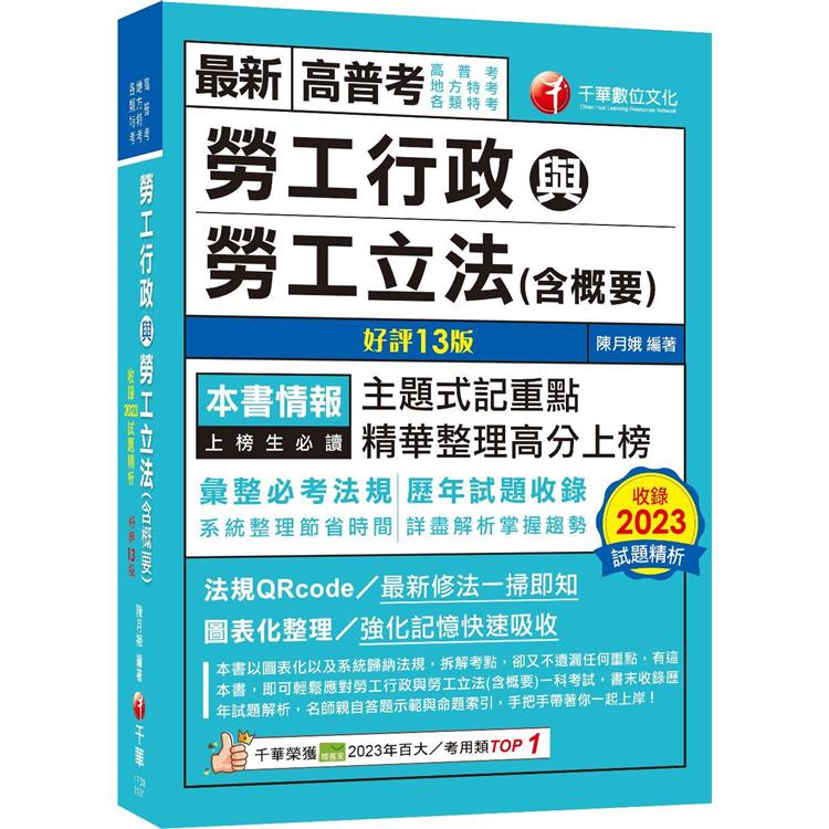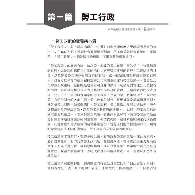 本書特邀勞工行政權威學者陳月娥博士編寫,陳教授除在大學任教外,並於勞工行政公務體系數十年,在教學及實務上經驗豐富。書中對高考、普考、地方三、四等申論題型考試精心編寫,內容涵蓋理論與實務,使你快速熟習相關之政策及法規。讓你上考場破題正確,更可答得漂亮完整,以爭取最高分數為目的。本書特色如下:勞工行政其相關業務自以勞工相關法規最為重要,千華為使你順利過關,特聘名師精編相關用書,使你快速熟習相關之政策及法規。特別提醒的是,勞動法令的修正頒布,影響人資業務至鉅,建議時刻關心勞動部的修正重點與背景說明,除了可上全國法規資料庫查閱最新法令之外,勞動部的網頁上,最新政策說明與立法重點懶人包,也是可以快速掌握修法重點的有利捷徑。同時若能多閱讀與勞工議題相關的報導,以及翻閱勞動部出版的〈台灣勞工〉(雙月刊)以及勞動力發展署出版的〈就業安全〉(半年刊),深信對於現況的瞭解會有更多的幫助,可有效應付部分時事題目的出現。