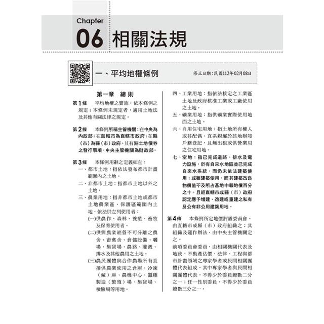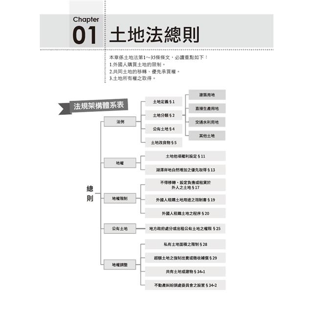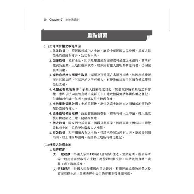 考過土地法與土地相關稅法概要者,一定都有感覺到本科的範圍相當大,凡是與土地相關的法令,如土地法施行法、平均地權條例、土地徵收條例及其施行細則、區域計畫法及其施行細則、都市計畫法、土地登記規則、地籍測量實施規則、非都市土地使用管制規則等都是可能命題的範圍,甚至是其他新興的法令規定,例如都市更新條例、公寓大廈管理條例等,都是這一科的命題範圍!有鑑於此,本書特別詳細收錄、解說,研讀完必能實力倍增。