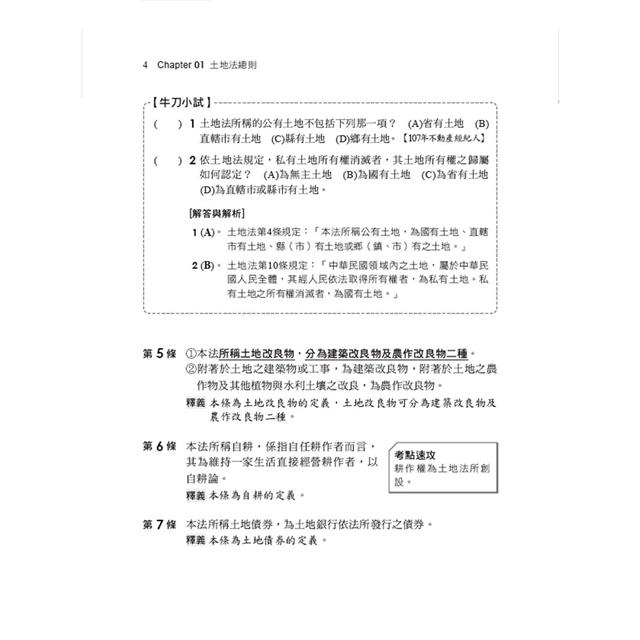 演算題目是測量自己是否吸收的一個很好的方式,所以本書在每個條文後面,均附有牛刀小試,幫助各位熟悉題型外,更可以慢慢累積解題的方法、速度等,對於考試都是很有幫助。最後,本書在每個章節後面,均附有精選試題演練,幫助各位了解自己對該章節的熟悉度外,也可幫助各位考生迅速了解最近幾年的命題重點。