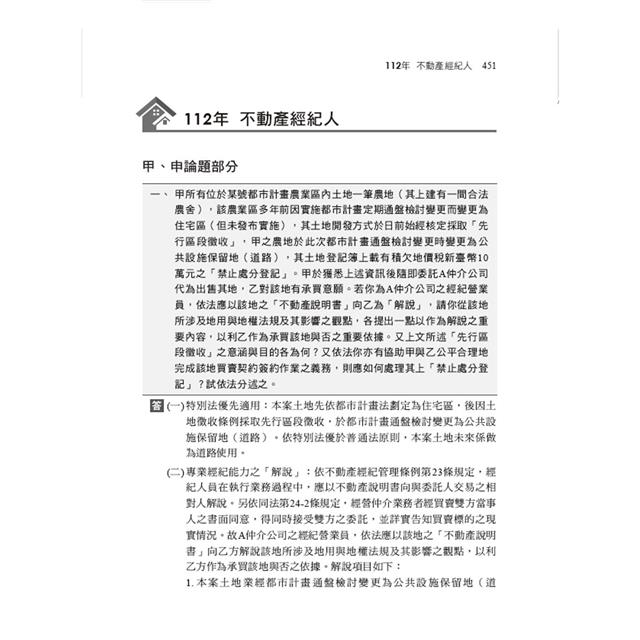 所有的大型考試,除了平日的認真準備,關切土地法規等相關新聞或議題之外,練習歷屆試題也是十分重要的,唯有練習歷屆考題才能清楚的掌握考試脈絡,有助於自己在考場上能臨危不亂,增加得分的機會。因此本書收錄歷年考試試題,一書完整掌握所有考情趨勢。在邁向不動產經紀人專業的路上,可獲得事半功倍之效。