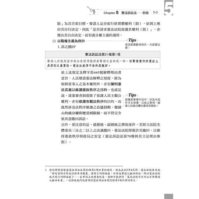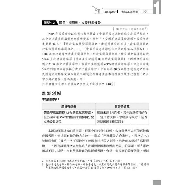 3.因應憲法訴訟法於112年5月又修法了,衡酌坊間參考書尚未收錄如此新的修法,因此將憲法訴訟法中的精華內容收錄於第四章的附錄中。