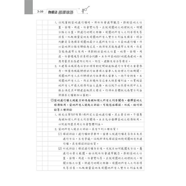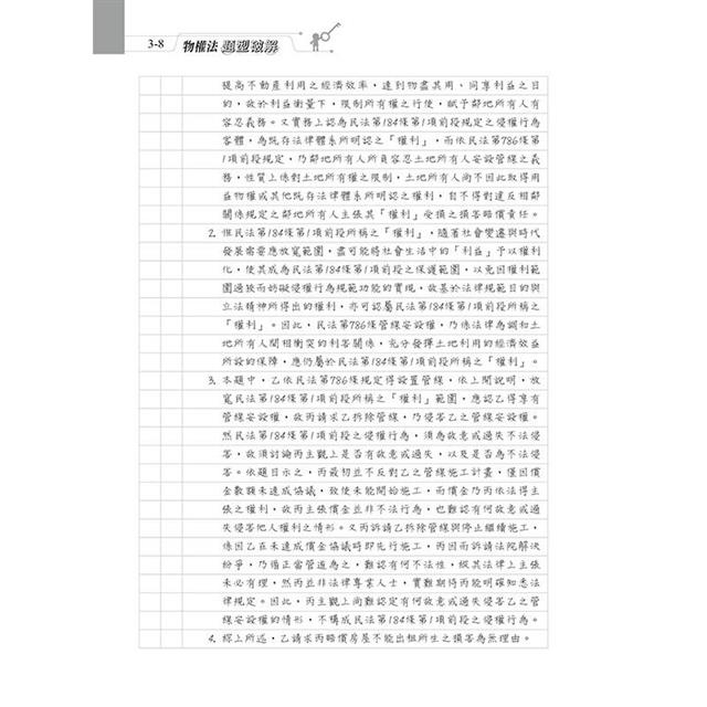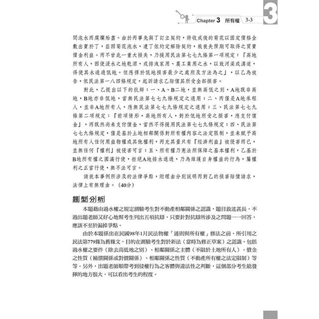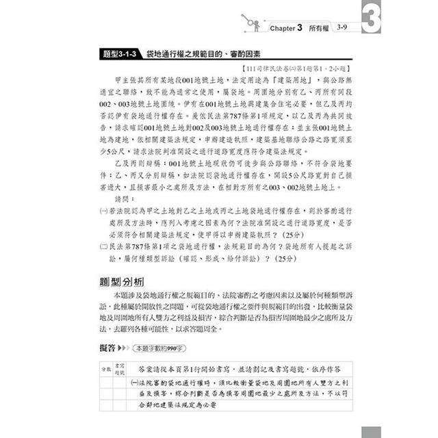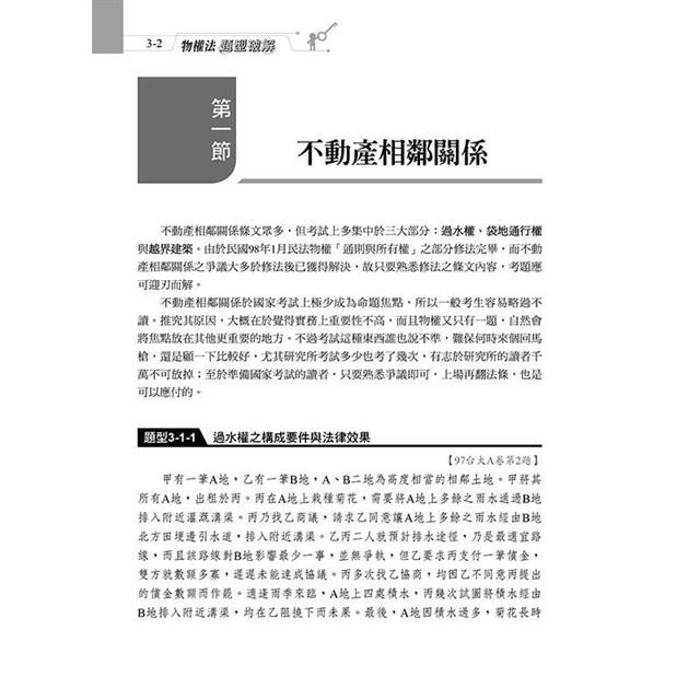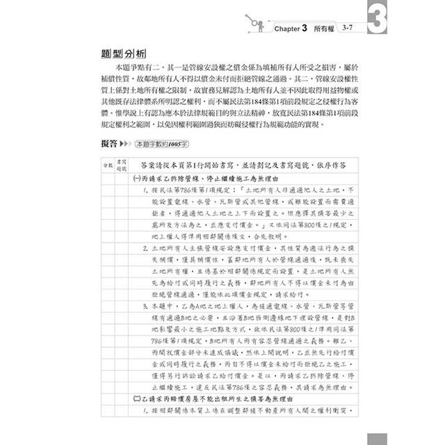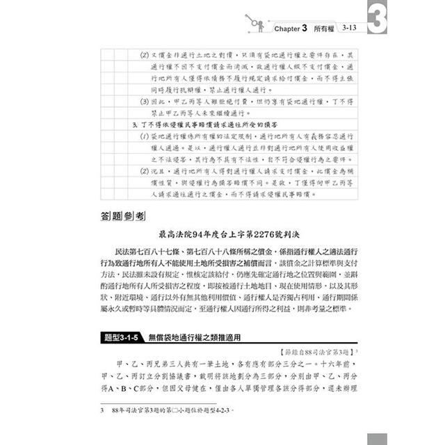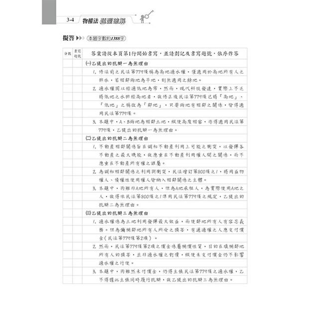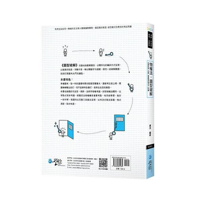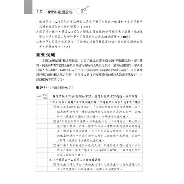 本書收錄最新司法官、律師、法研所物權考題。針對物權法體系,以爭點式安排考題,綜覽民法物權編各重要考點,有系統學習,免於一知半解。每題均以完整三段論法呈現,以判決式寫法答題,格式清楚,取分快速。