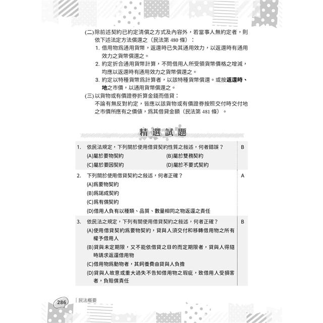 A:本書萃取民法精要,各單元後附精選試題;書後並收錄108-112年試題,申論題、選擇題100%題題擬答與詳解!