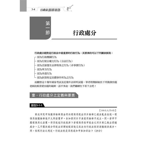 筆者後來慢慢摸索出讀書方式,其實第一遍還是先讀過去,有個底之後,再來讀解題書。此時挫折感一定超大,但是這階段卻很重要,要嘗試把這些錯誤和讀過的爭點作成筆記。等做完這扎實的步驟後,再回去好好讀一遍行政法用書。這時候應該會豁然開朗,你會慢慢發現你讀第一遍時所認知的重點,有些考試根本不會出;有些你覺得不是重點的,出題老師卻很愛,這時再讀的時候,對於這些部分必須再加強。於是心中就會有種比較踏實的感覺,知道「就考試所應著重的重點」在哪。而本解題書就是在增強讀者信心之用的書籍,請大家細心品味。