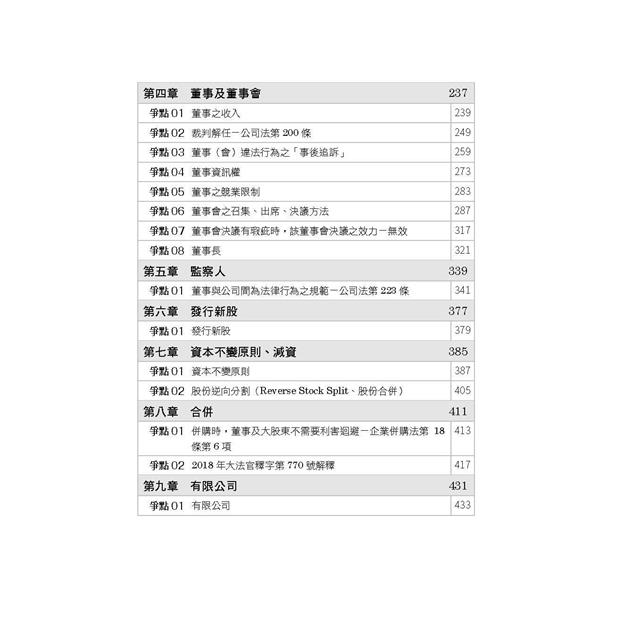 很開心可以用這本書跟大家見面,這是一本嶄新的公司法爭點暨解題書,書中收錄近五年的臺灣大學、政治大學、臺北大學法研所公司法考題,以及近五年的司法官、律師公司法考題,以及近年來的重要公司法國家考試題目,並附上完整擬答,希望可以讓讀者對於近期的考試內容、出題方向、解題方式,有所幫助。