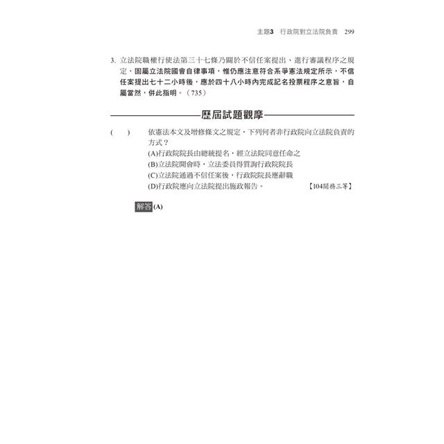 在各主題的重點表格之後,則匯集了重要的「歷屆試題觀摩」,將相關考題依難易度先後呈現,以協助應試者驗收學習成果。同時針對若干難題提供詳細的解析,以使應試者在準備考試的過程中,得到事半功倍的效果。