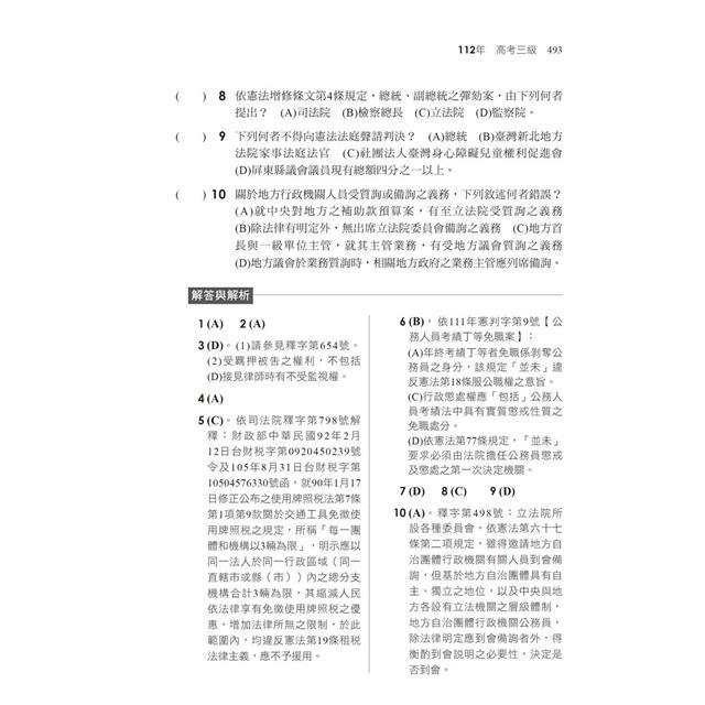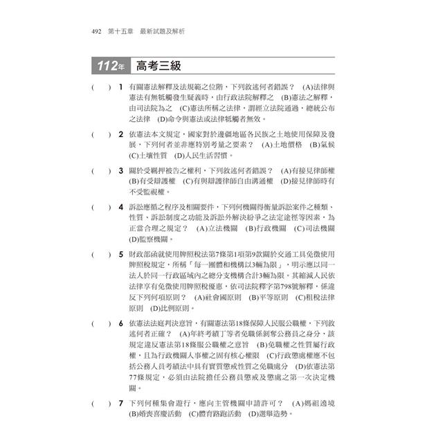 在本書的最後,則提供了「最新試題及解析」,特別臚列了111∼112年度各類科憲法的完整考題並搭配上解析。