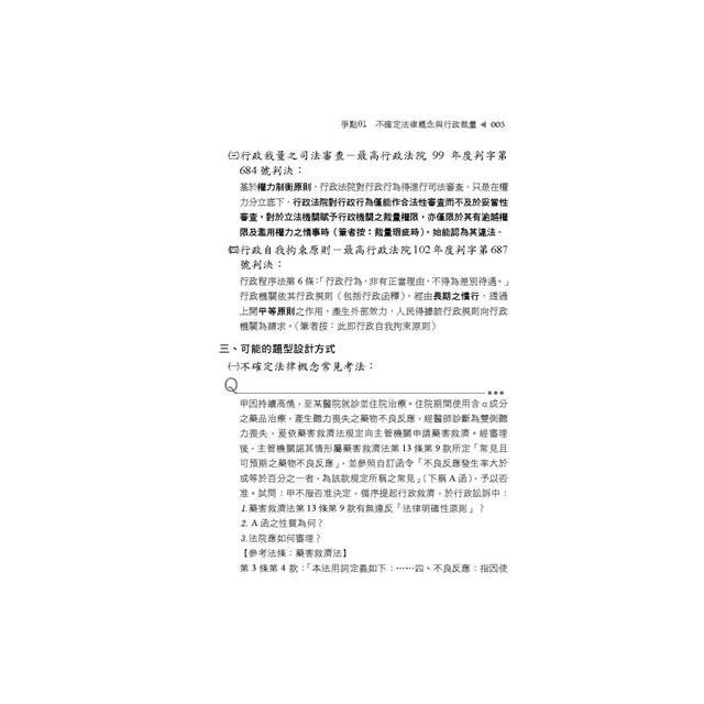 行政法科目的複習,首重實務見解的熟悉,其理由在於,近年來的行政法實例題,大部分都是由實務判決所改編,熟悉實務見解才能精確掌握考題爭點;再者,實務見解的論述,是同學考卷上「大前提」的重要素材,筆者近年來大量批改同學的申論題,大部分同學所面臨的問題都是「知道考什麼但寫不多」、「知道爭點但論述不出來」,多看實務見解對法條的詮釋,就能有效提升考卷篇幅(而且不是廢話堆積)。因此,本書以「爭點」分類,選出近年來考試熱門爭點,配合筆者上課黑板上的「架構圖」,先將爭點架構呈現在書上,有效幫助同學快速複習體系觀念,而後再補上此爭點的重要實務見解,加深同學對此爭點的理解,最後再配上本爭點的可能考題出法,讓同學能將爭點與考題結合,以達成最有效的複習。本書中的架構圖,都是筆者上課版書的呈現,也是筆者自己學習行政法所萃取的精華,分享給各位同學。本書定位為「讀本」,用途在於幫助同學快速進行「總複習」,因此適合考前衝刺使用,搭配筆者所出的解題書,複習效果更佳。本書得以付梓,感謝廖姿穎同學對實務見解的整理,也感謝志光學儒集團讓我有機會教授行政法課程,亦感謝保成出版社的邀稿和不厭其煩的排版及校對,最後,希望本書能讓廣大考生儘早脫離考海,這是筆者教學上最大的心願。