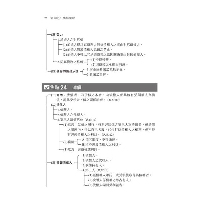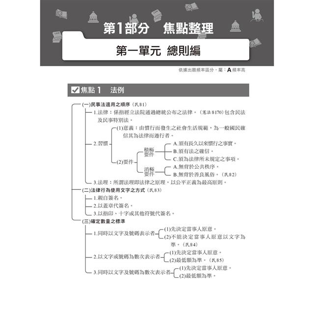 民法五編依照「總則」、「債編」、「物權」、「親屬」、「繼承」分別以焦點說明,給各位該編完整的體系架構,其次的「實戰演練」遴選最具代表性的測驗題型以及申論題型給各位做練習,考題深度及廣度兼具,並且輔以圖示及解析,希望能夠加深你的記憶,以便在考場上能夠針對所學的概念靈活運用,以獲得高分!