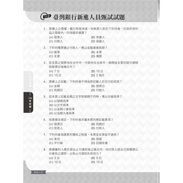 歷屆試題詳解,收錄111-112年試題,共9份,100%題題詳解。讀者可透過演練各銀行考試的考古題來檢驗自身實力,不明白處可研讀解析進行強化,熟能生巧,當練習到對題目有題感時,代表對法條的直覺越來越精準,即便非法律相關科系畢業,也能輕鬆自學應戰。