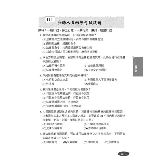 第貳部分歷屆試題詳解,收錄110-113年公務人員初等考試、鐵路(佐級)/身障/原民人員特種考試與司法人員特種考試,共13份試題,100%題題詳解。讀者可透過演練各類考試的考古題來檢驗自身實力,不明白處可研讀解析找到關鍵,並熟能生巧,訓練自我達到閱讀題目後即可知考點何在時,代表對法條的直覺越來越精準,即便非法律相關科系畢業,也能輕鬆備考。