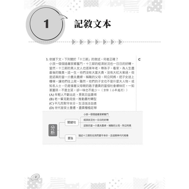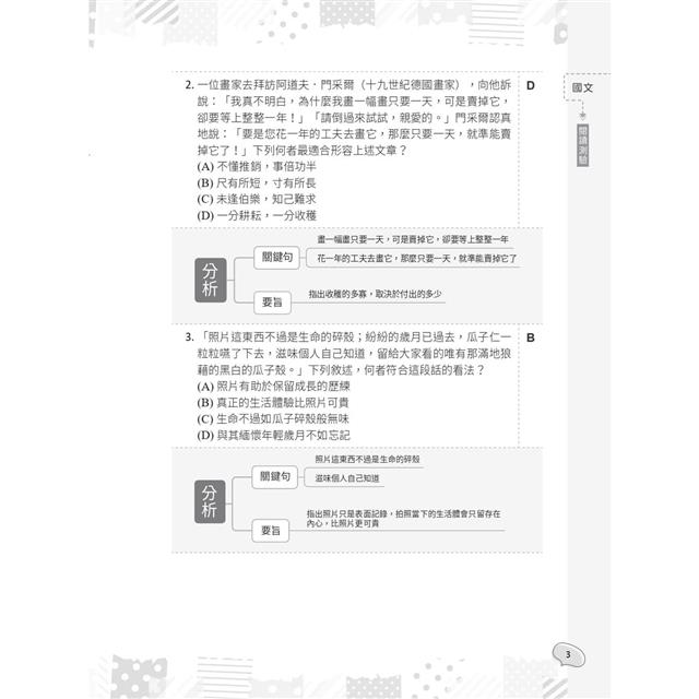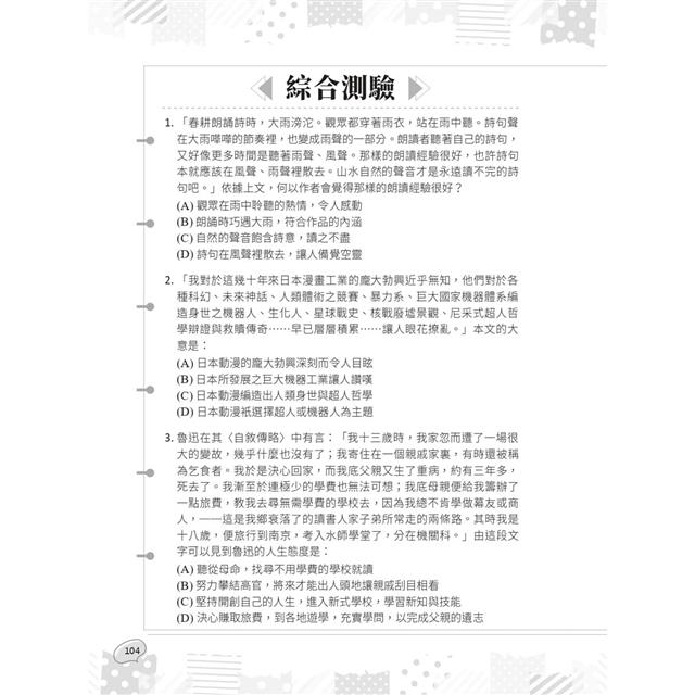 單選題各主題中以閱讀測驗比重較高,題幹常會有一至數行引文,應考時務必耐心閱讀題幹,仔細看清題目問的是什麼。