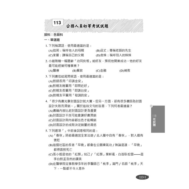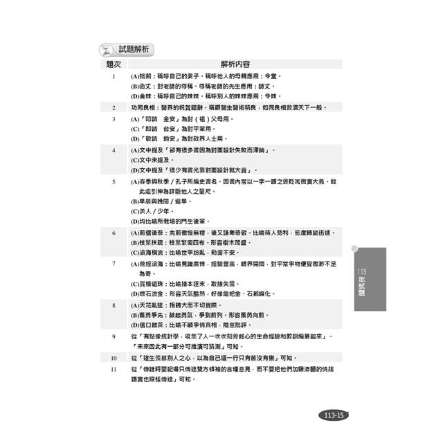 書末收錄111-113年公務人員初五等、高普,以及司法、身障、原住民、地方特考等五等考試共11份,所有題目皆由三民補習班國文名師群提供詳盡解析,幫助讀者快速掌握命題重點,輕鬆破解考題!