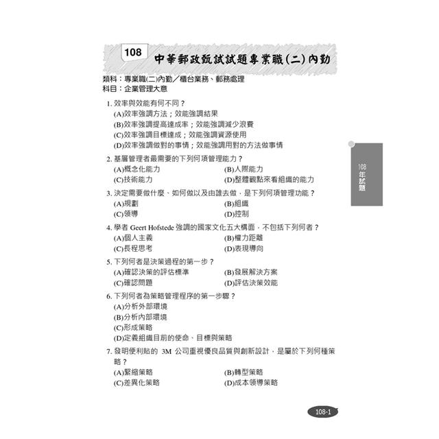 這本《企業管理》(9786267456149)適用於適用於中華郵政職階人員甄試專業職(二)內勤「櫃台業務、外匯櫃台、郵務處理」等類科。