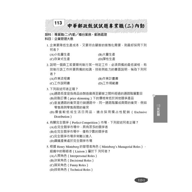 書末收錄108~113年中華郵政甄試試題-專業職(二)內勤試題共5份,100%題題詳解。讀者可透過演練考古題來檢驗自身實力,不明白處可研讀解析進行強化,熟能生巧,當練習到對題目有題感時,代表對答題的直覺越來越精準,即便非企管相關科系畢業的一般考生,也能輕鬆自學。