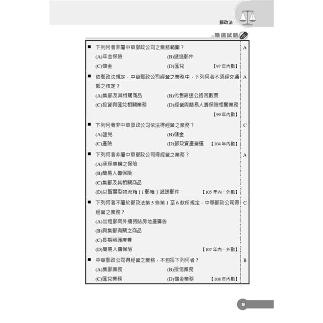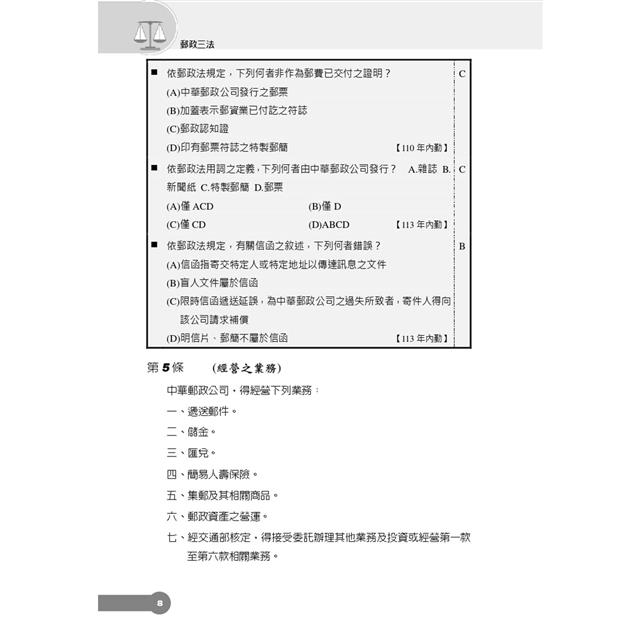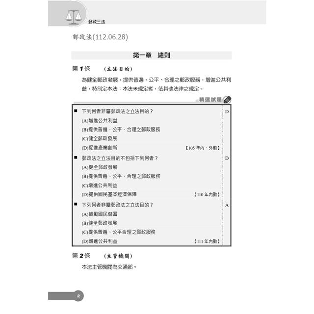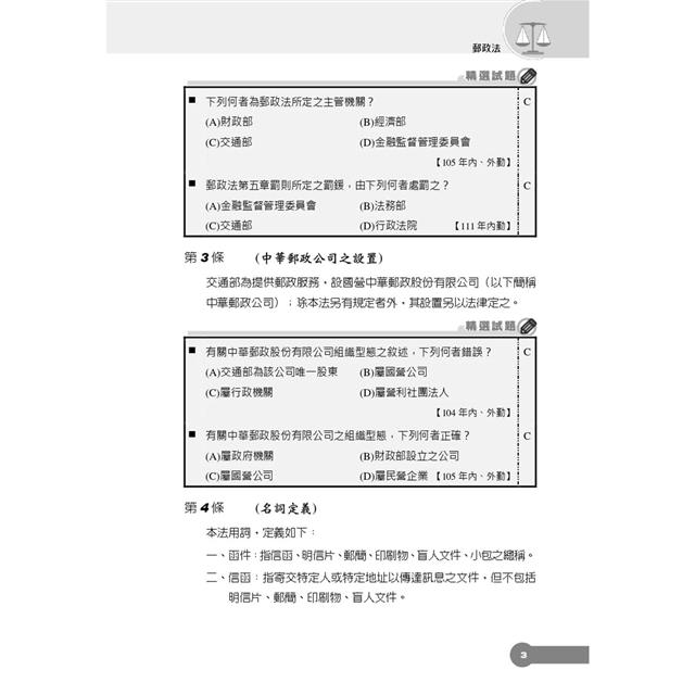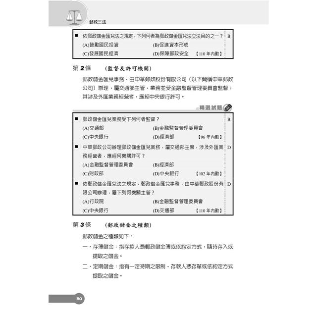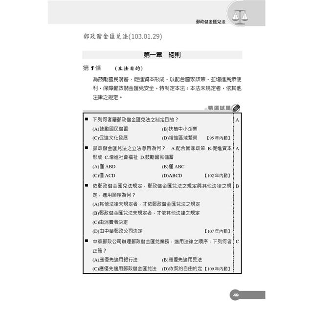 本書有別於坊間各家考試用書,作者親自研究近年郵局考試試題,再將相同條文考點的試題,彙整嵌入相對應的法條。背完條文即可演練題目,掌握歷年出題脈絡。讓法典除了是查詢法條的工具書外,更結合豐富試題,絕對比純法條書更實用,而條文後題目越多表示越常被命題,讀者可立即知悉被頻繁命題的考點,不錯失任何分數。