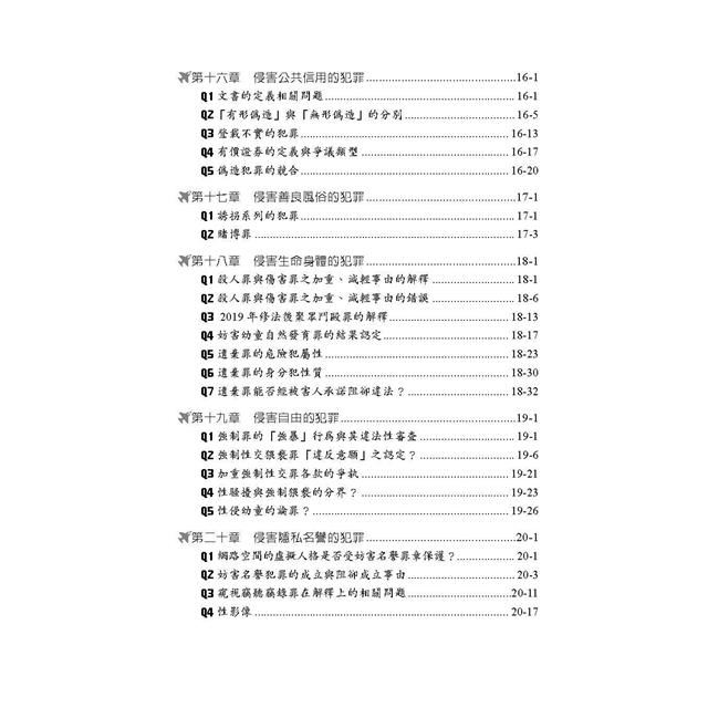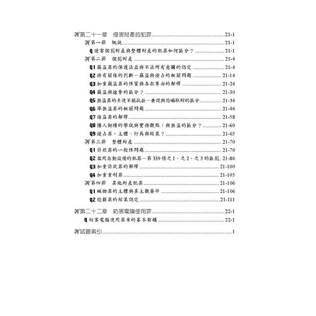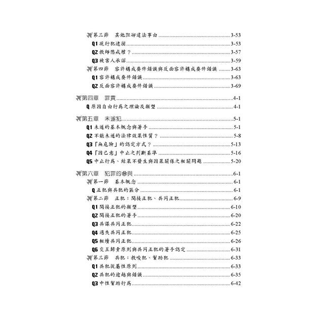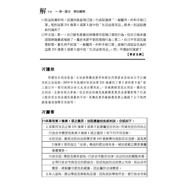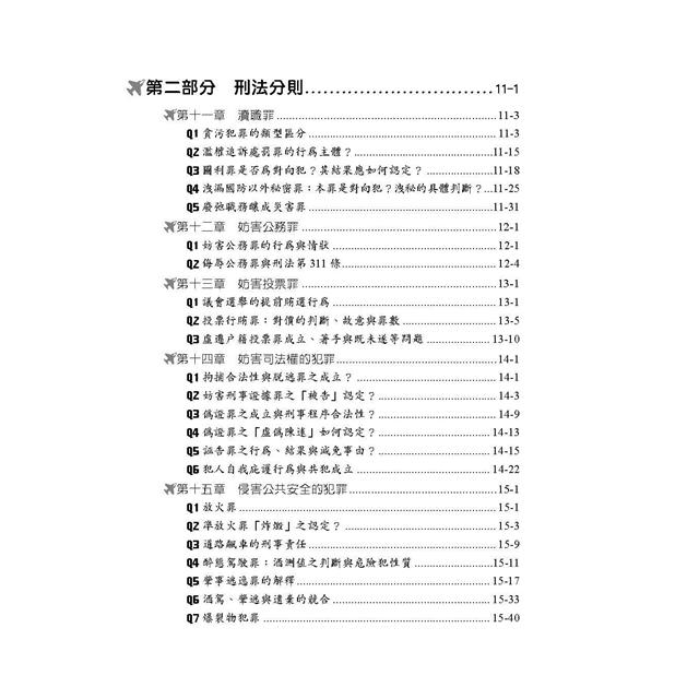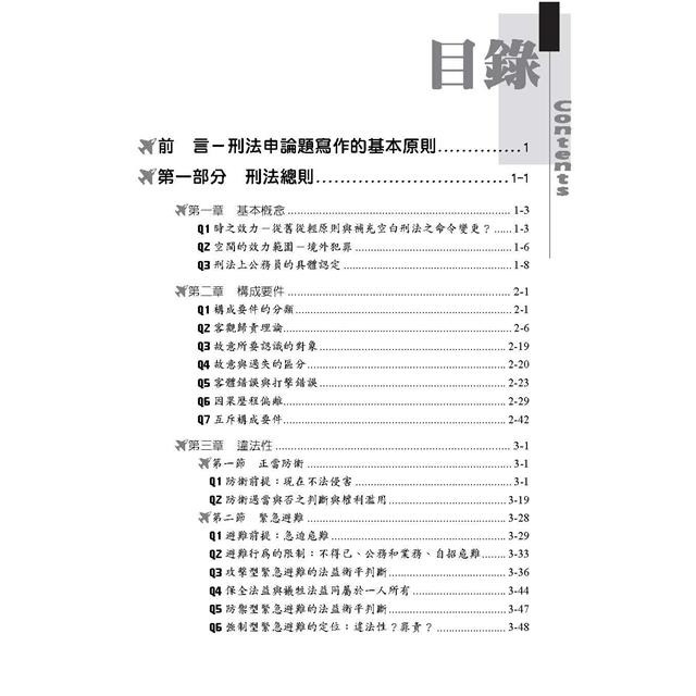 二、由於進階型的考題許多都牽涉到繁雜的罪名與爭點,因此,作者也在複雜的題目加入「答題架構」供讀者速覽,以免在閱讀時有「見樹不見林」的困惑。