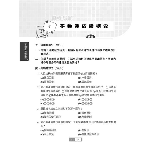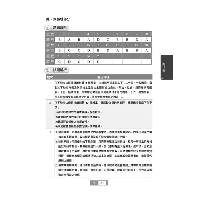 第一部分「模擬試題」彙整了各年度相關考試的題型,作者由千百道的題目中,為讀者精挑細選出3回模擬試題,題題皆是經典,仿真題型及題數,讓考生每次做答猶如身歷其境,幫助考生透過實戰模擬,鍛鍊答題技巧與速度,一方面熟悉題型與出題方向,強化考試重點;另一方面,則找出自己弱勢之處,即刻補強。