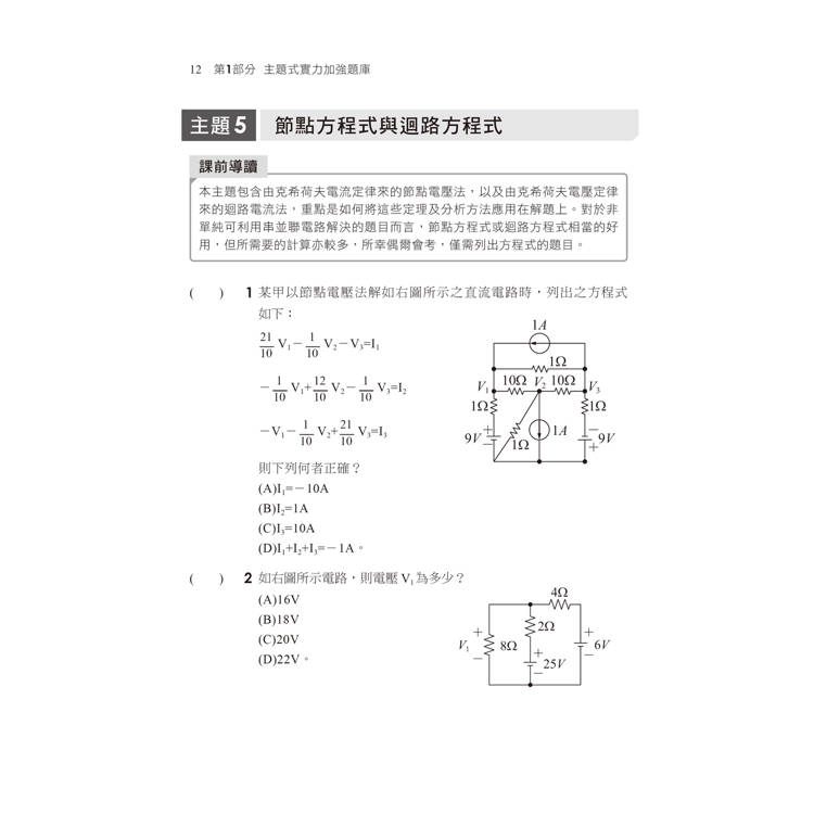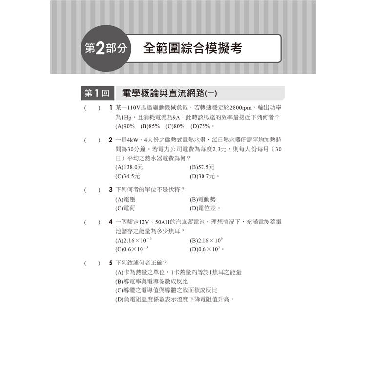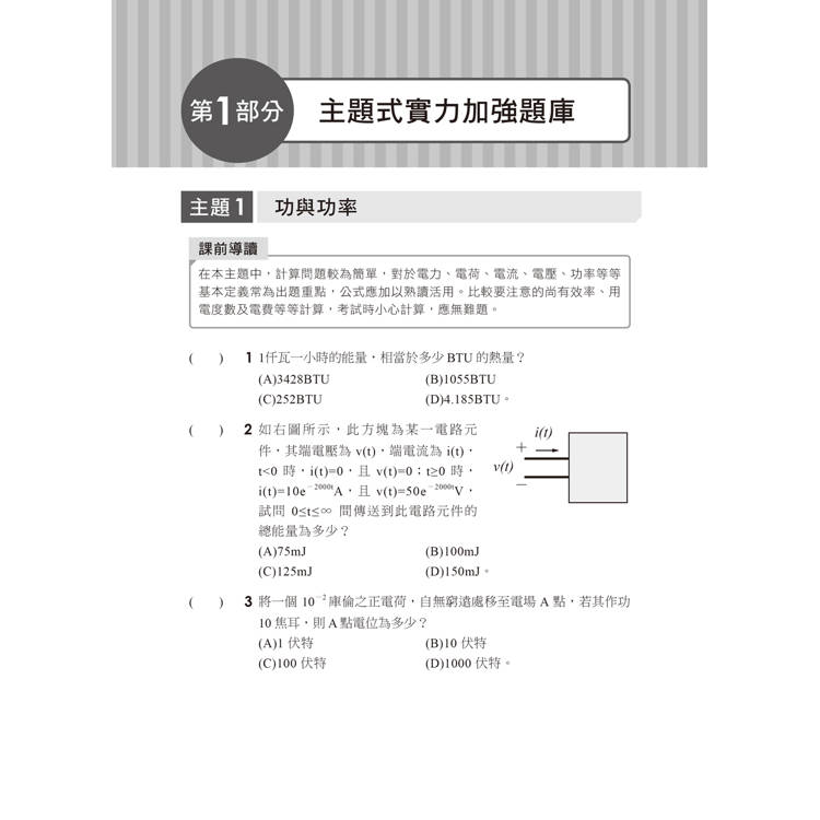 基本電學此一考試科目包含的範圍相當廣泛,乍看之下不易準備,但因課程範圍廣泛,可供命題的重點多,為求出題分布均勻,反不易出現艱深偏僻之題目,使得考試難易度並不如想像中的困難。而基本電學實習雖然與基本電學分列在專業科目(二)和(一)中,但其考試範圍和內容卻相當類似,一起準備可收事半功倍之效,故本書將此兩科目一併收錄,並由名師依課綱精心編列重點,期能藉由本書,以最短的時間,熟悉本科的考試重點,提升讀書效率。
