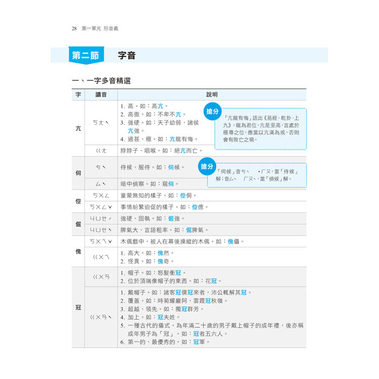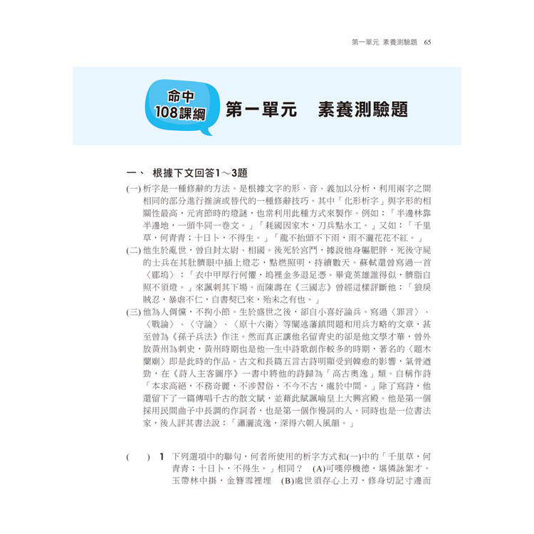因應108新課綱,這本書試著從日常生活的角度來編寫,以表格化的方式,搭配雙色標示重點,並以小視窗的方式提點考試關鍵精要及延伸補充,內容不以現行版本的課文為主,而是打散後彙整成形音義、語言、應用文、修辭、韻文常識、散文常識、文學與國學常識、文化基本教材及作文九個項目,並加入歷屆考古試題及各類題庫,另外特別收錄素養題型,絕對可以命中最新的出題潮流,務必使同學在迎接統測的重大關卡時,能在最短的時間內達到最佳的學習成果。