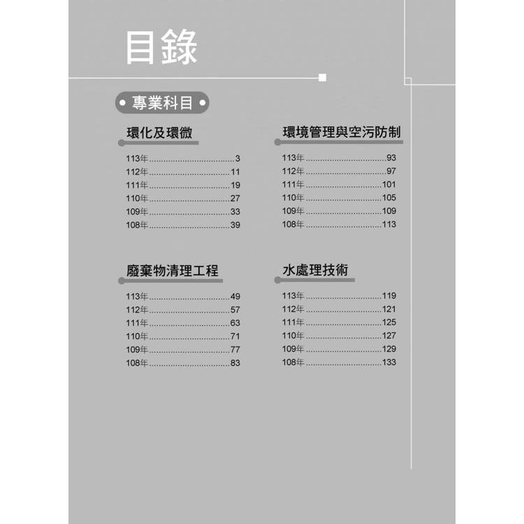 本書收錄考科包含:環化及環微、廢棄物清理工程、環境管理與空污防制、水處理技術