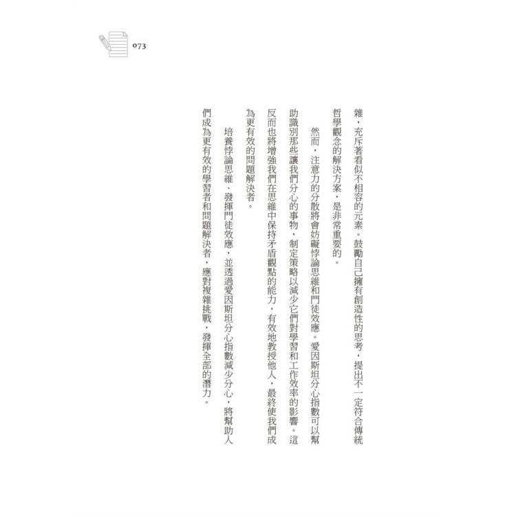 在本書中,將有機會透過實用指南、自我反思和發人深省的概念,發掘自己的學習風格,從而激發自身內在的「愛因斯坦」潛能。這些知識適用於各年齡層,幫助我們變成更有創造力的思考者。對於每位想要獲得自信、充分利用自己的效能,同時遊刃有餘地消化複雜資訊的人來說,本書就像良伴摯友。