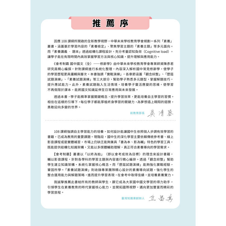 本書講義內容整合國中生國文知識點,學生可搭配歷屆題鞏固基礎,並練習師資精心設計的素養題,全面提升大考作答實力,滿足國中生學習需求。