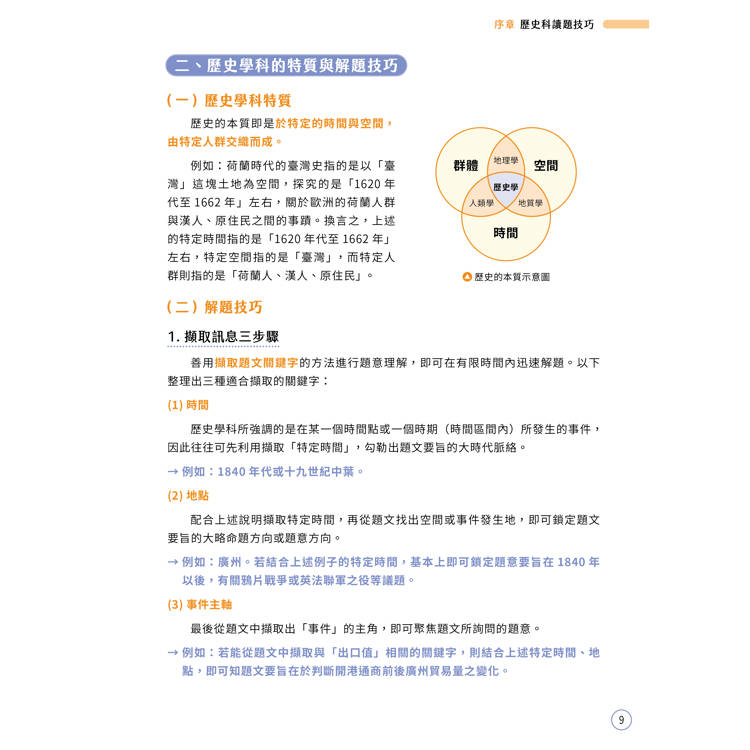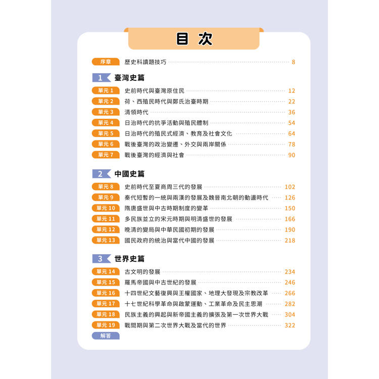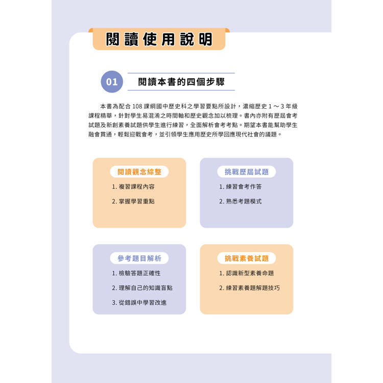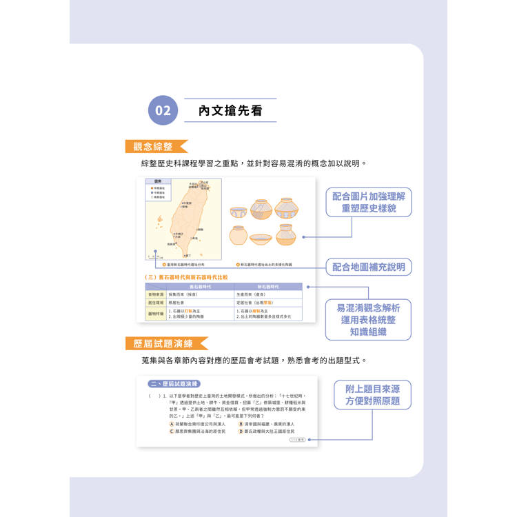 為主要的內文構成,統整歷史科之學習要點,並搭配地圖及圖表補充,幫助學生快速掌握關鍵知識。