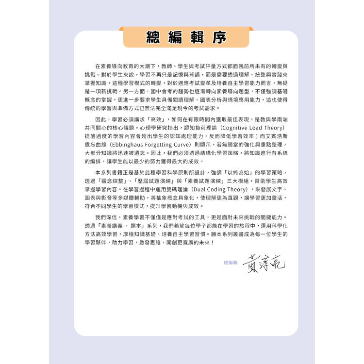 專業師資綜整新課綱重要觀念,幫助學生迅速掌握知識架構與會考關鍵考點,系統化高效複習,適用所有版本,自學複習成效倍增。