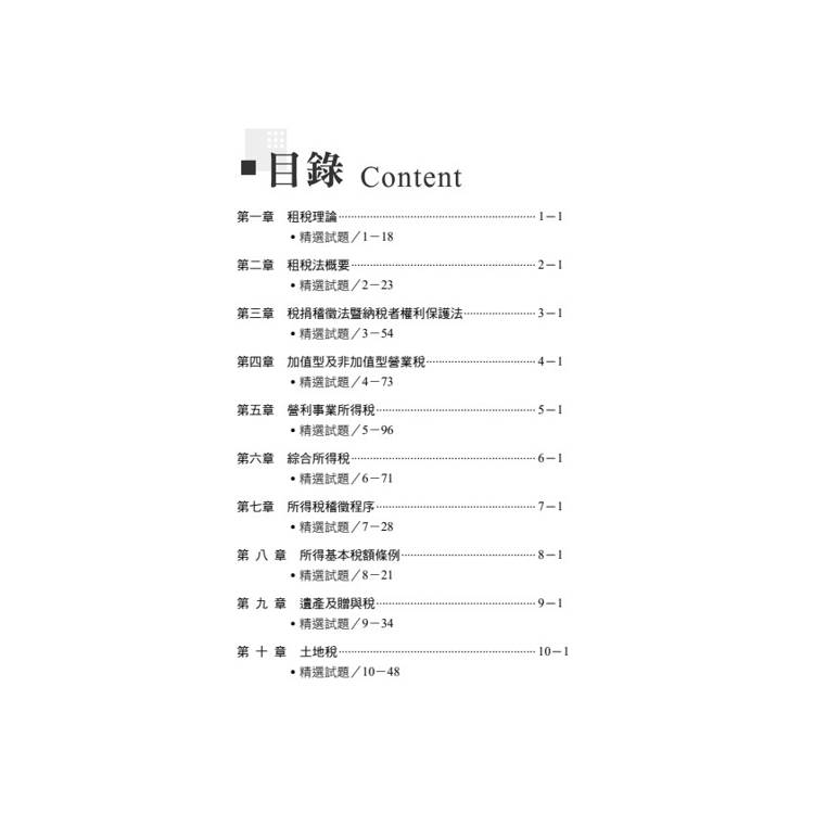 最後,從考試角度來說,稅捐稽徵法、加值型及非加值型營業稅法、所得稅法、遺產及贈與稅法及土地稅法,俗稱五大稅,就幾乎占考試得分70%以上,所以,在準備考試的你,千萬不可忽略這五大稅,除此之外,針對各年度重要考題所牽涉到之修法內容,也都會成為重要考點,所以除了將本書各章節詳讀後,再透過本書所附之考古題練習,相信可以快速掌握出題方向,讓稅法不再是一個雜而難以掌握之科目,共勉之。