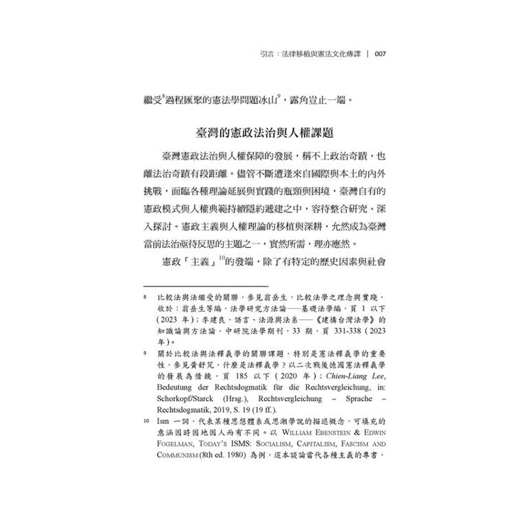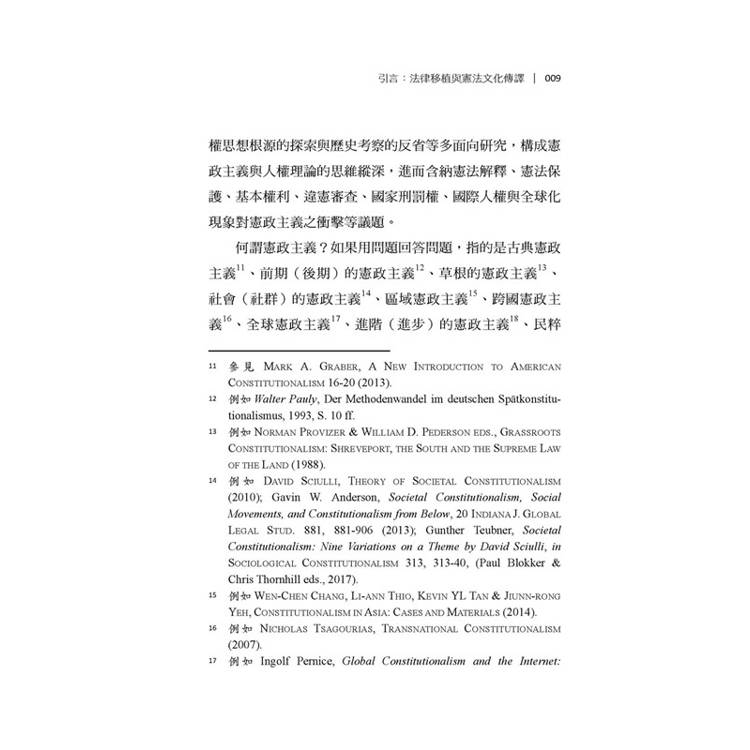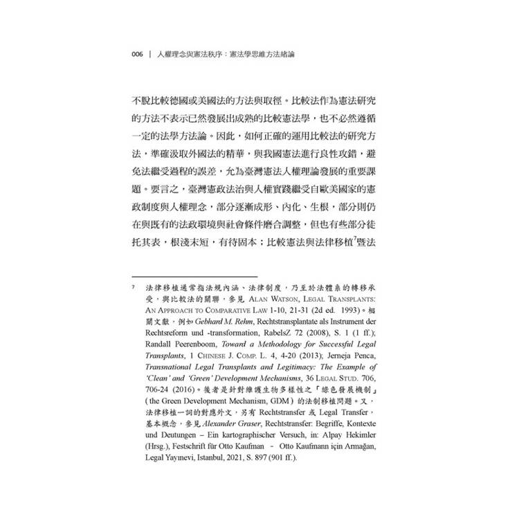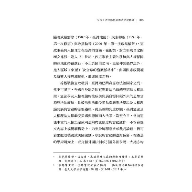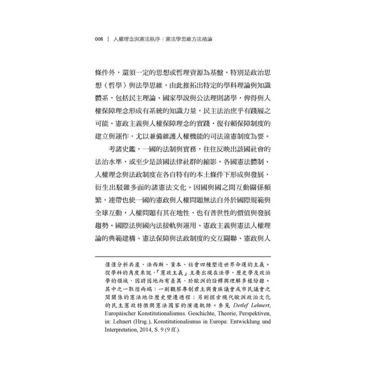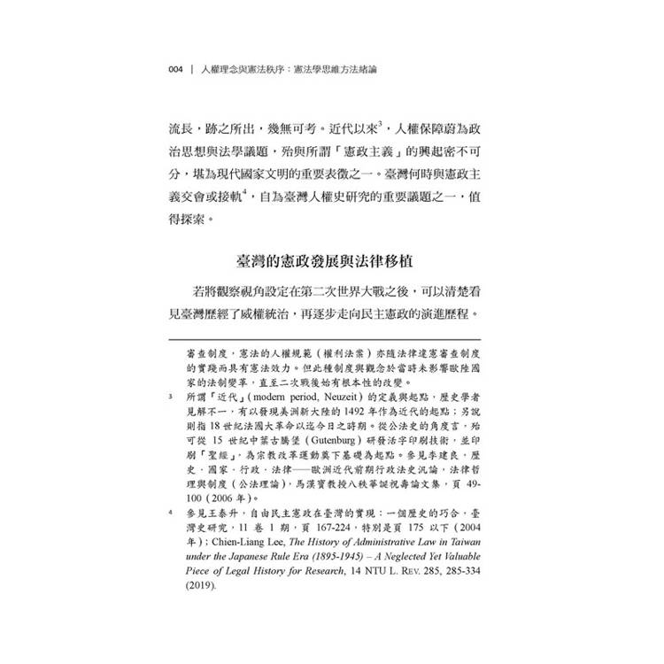 臺灣憲政制度與人權理念繼受自泰西東洋諸國,部分逐漸成形內化,部分則持續磨合調適。在法律移植過程中,人權理念史、憲政制度與法學方法的關聯論題,始終是臺灣公法社群的共通課題與普遍困境,尤以欠缺具歷史縱深底蘊與條理思維方法為最。本書嘗試從憲政主義歷史源流與憲法學方法論的視角,對人權理念進行原理推演,建構憲法秩序的思維體系,期使基本權蘊含秩序理念、論證紋理,成為貼近現實、可資適用的客觀法規範,而非只是某種政治、道德或價值的決斷。