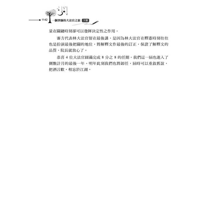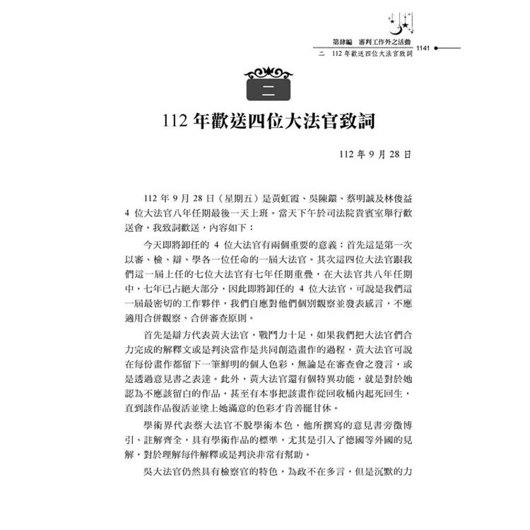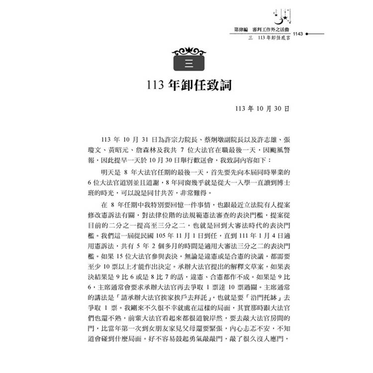 本書是作者擔任中華民國大法官(105年11月1日至113年10月31日)前後作品之集結,內容包括擔任大法官時所撰寫之意見書以及審判工作以外之觀察與紀錄。寫作目的希望讓一般民眾瞭解大法官釋憲工作之內容。分為四編,第壹編就任大法官,收集作者自獲律師公會推薦、總統提名,經民間團體、媒體及立法院審查之經過;告別律師生涯之感觸;以及進入司法大廈之觀察與體會等等。第貳編釋憲相關議題所感所思,收錄大法官任期內從事釋憲之所感所思,與其他國家憲法法院互動的感想,以及對外國重要憲法時刻的觀察與省思等。第參編協同意見書與不同意見書,收集作者於大法官任期內對於大法官所作出解釋、判決或不受理決議、裁定所提出之協同或不同意見書。本編各章係以大法官解釋、判決、決議或裁定所涉及社會生活之性質作為分類標準,性質相同或接近者歸屬於同一章。共有四十章,可見大法官釋憲範圍廣泛,與人民生活密切相關。第肆編審判工作外之活動,收集作者在大法官釋憲工作以外較為生活化的紀錄與體驗,包括以大法官身分參加活動的致詞以及推薦書籍的序言等。
