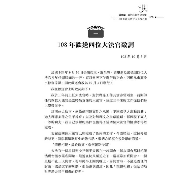 本書內容除了對於大法官所作出解釋、判決或裁定所提出的意見書之匯集外,另一部分內容是擔任大法官期間較生活化之感想與觀察,從被提名到立法院審查,上任直至卸任之記錄與省思,期間正逢我國或其他國家重大憲法時刻之比較與檢討(如釋憲滿70週年,68學運滿50週年,德國基本法施行70週年、75週年等),本人認為透過這些紀錄、省思、比較與檢討有助於理解大法官之釋憲活動以及我國今日之憲政處境。