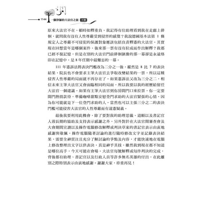 完成這本書是對自己擔任大法官職位的負責,也是向推薦我擔任大法官的台北律師公會、律師公會全國聯合會、總統府組成的司法院大法官提名審薦小組、民間團體組成的大法官監督聯盟、提名我的蔡英文總統以及表決通過的立法院,有所交代。