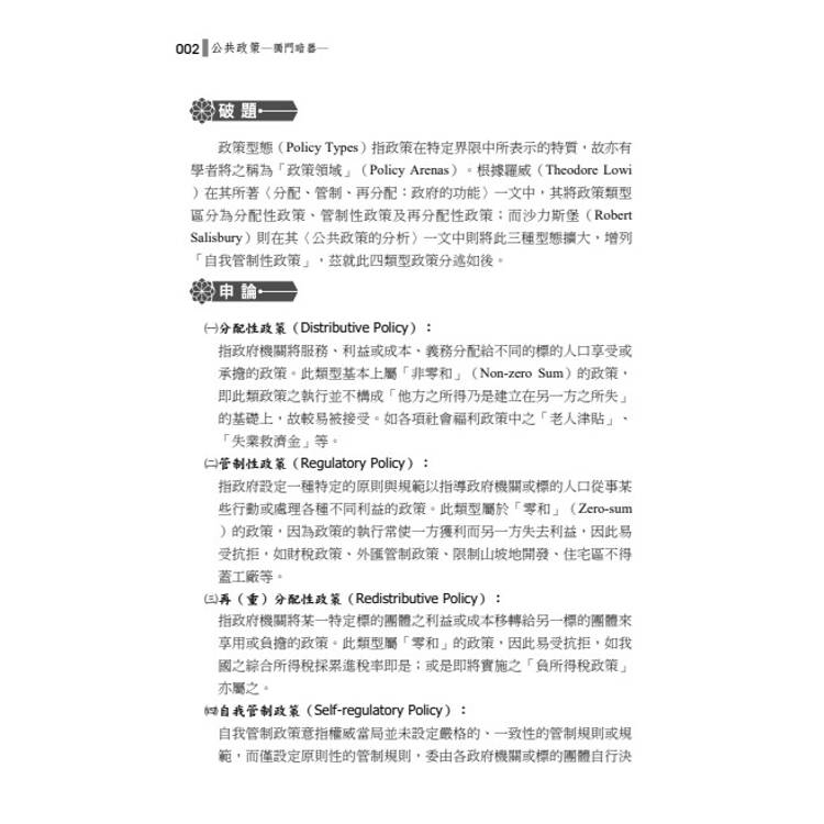 第三,獨立介紹解釋名詞,因公共政策高考三級以上考試與研究所入學考試,都有可能考「解釋名詞」題型,故蒐集重要名詞數十則,並盡量不與申論題型內容重複介紹,讓讀者事半功倍、百戰百勝!