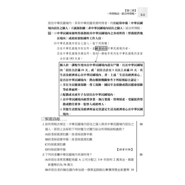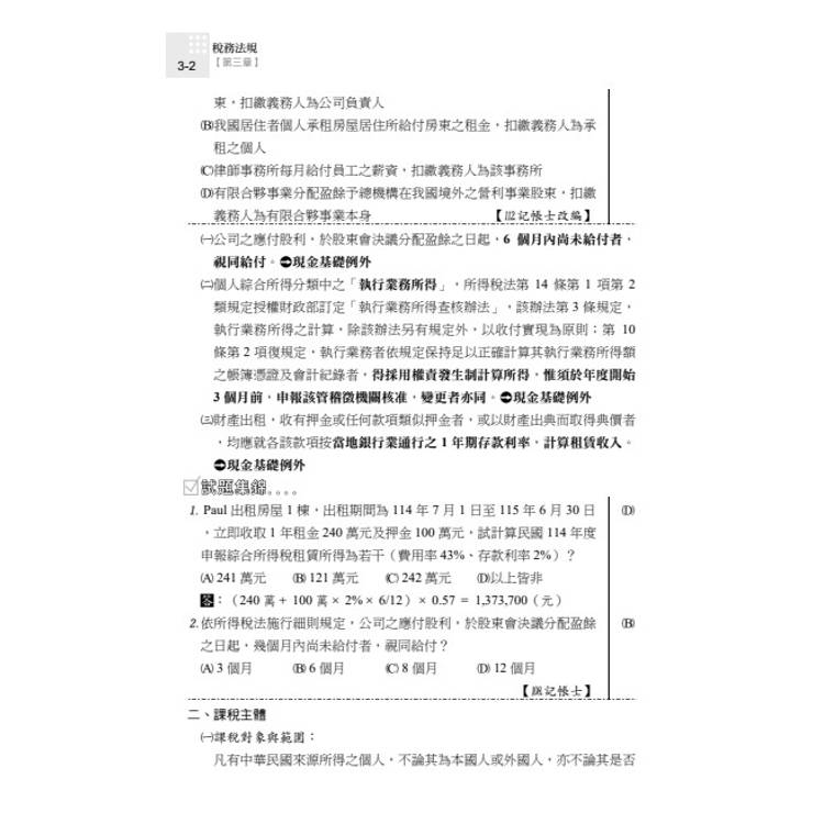 放入最新114.8月貨物稅條例、產業創新條例、CFC案例等,各章內文依新法修正,各章也增刪到114年最新的會計師相關稅法試題。