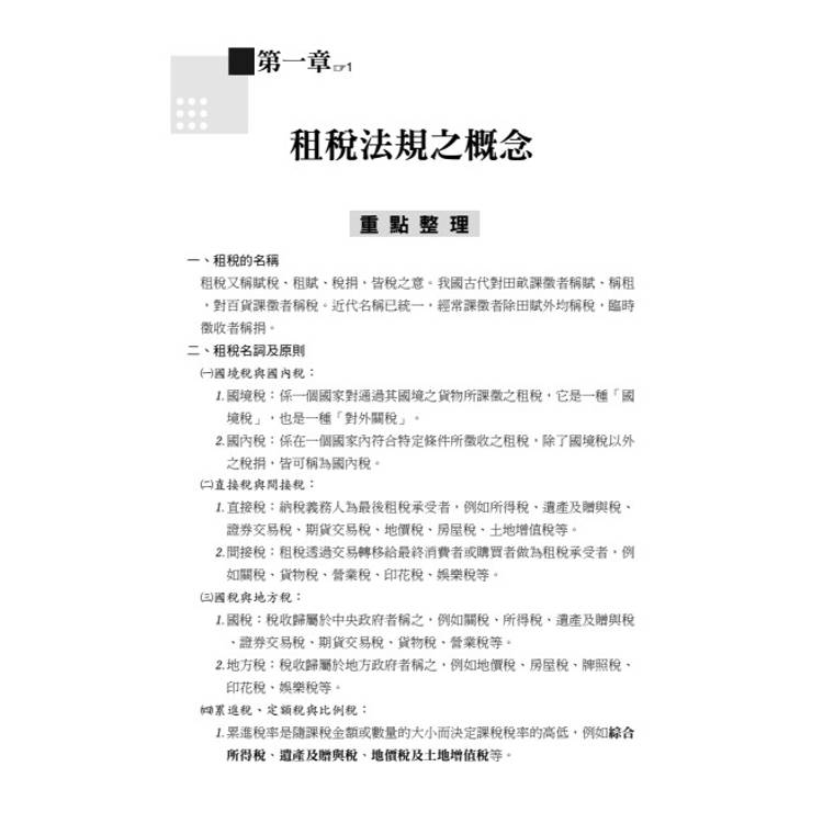 .教材採「圖表整理法」,上課邏輯清晰,精析各稅目體系,幫助學生快速理清法條架構,並且能緊跟時事與考題趨勢,提升應試能力。