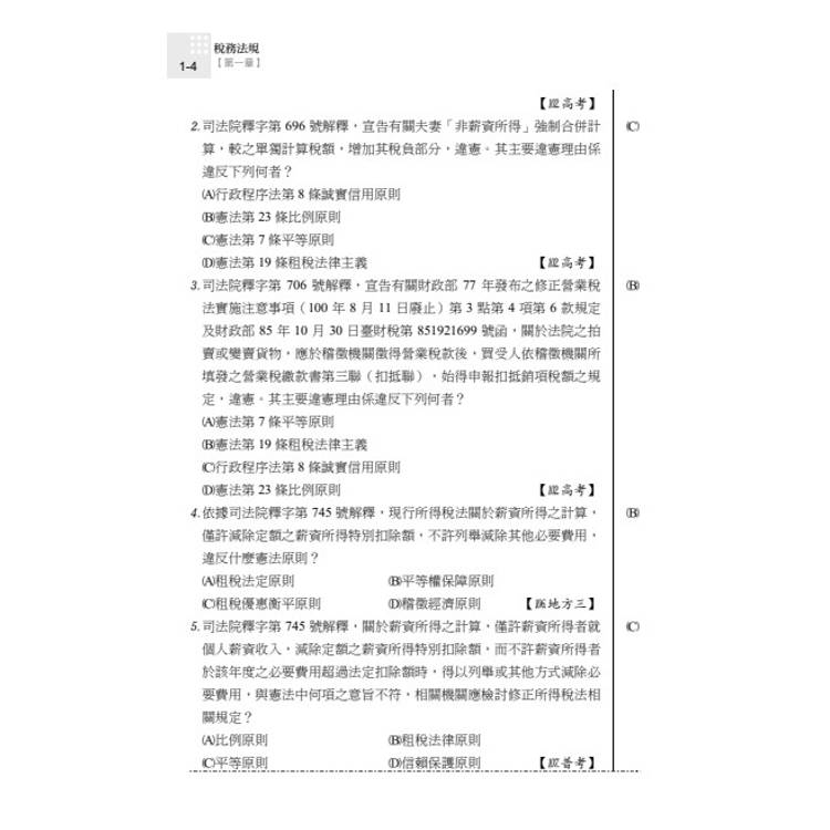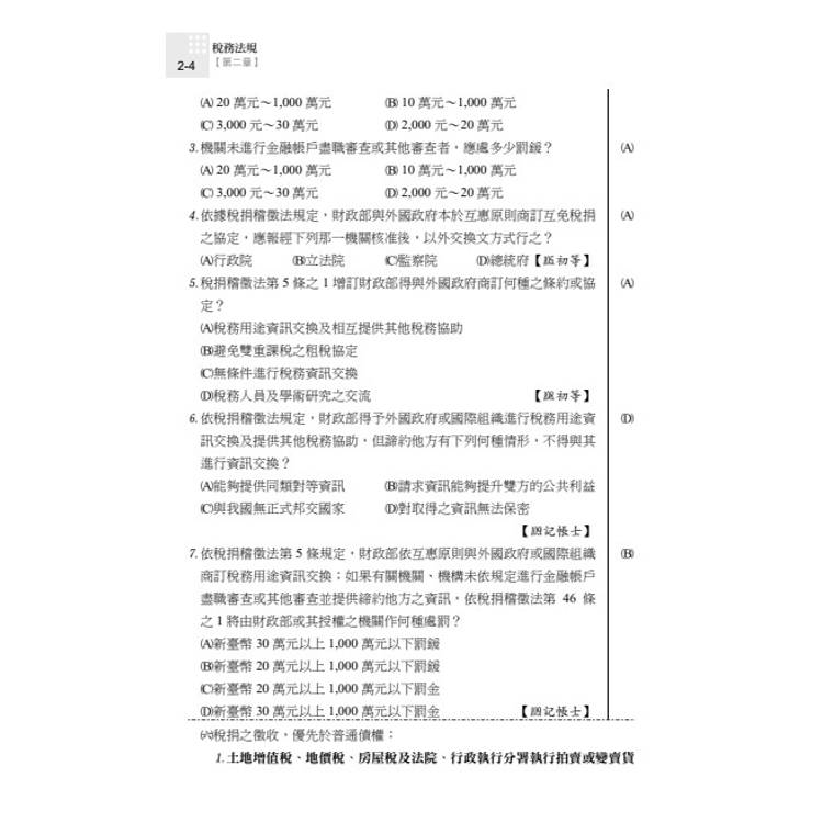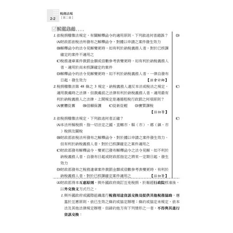 稅務法規應熟讀本書第二~六章、第十三章及第十四章,考試類型為五十題選擇題。