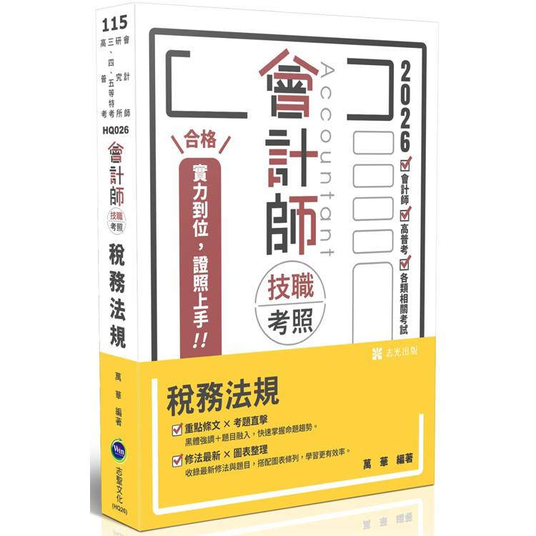這本書就是你的秘密武器。把艱澀法條變成白話重點,搭配圖表整理,讓你一看就懂、不再死背。更棒的是,歷屆考題直接融入章節重點,讀完馬上練,出題方向一清二楚!不論你準備高普考、會計師、記帳士或初等考,都能快速抓到核心,建立解題信心。買這本書=省時、省力又高分,考場輕鬆駕馭。