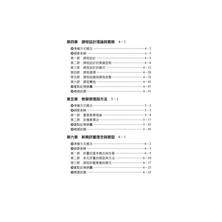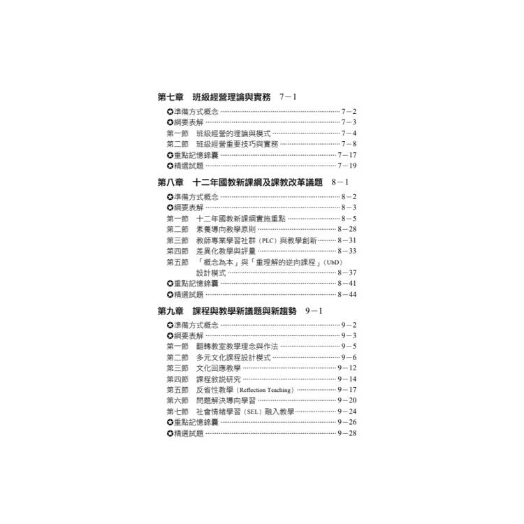 本書每章內容最後均精準篩選一些最新、最符合考題趨勢、且容易再度被命題的選擇題,提供給考生加以練習,也留意挑選教師專業素養導向的題型。本書主要是綜整的讀本,並非題庫書籍;因此,問答題部分主要附上兩題解析及精選試題觀摩。考生可以詳加練習運用,並搭配專門的題庫書籍加以練習。