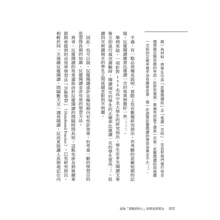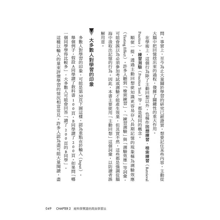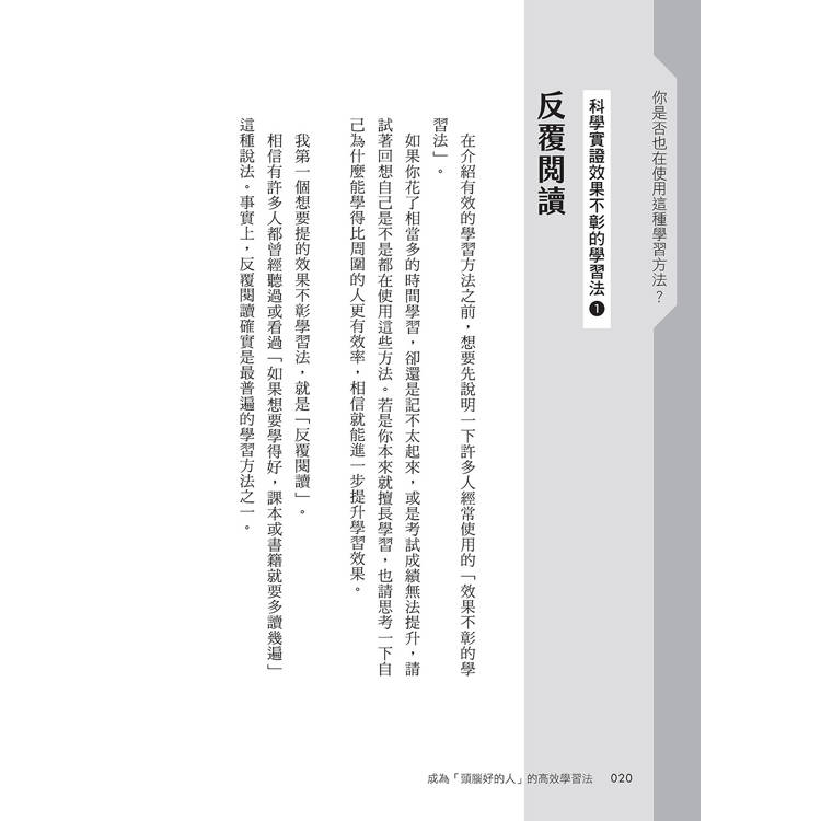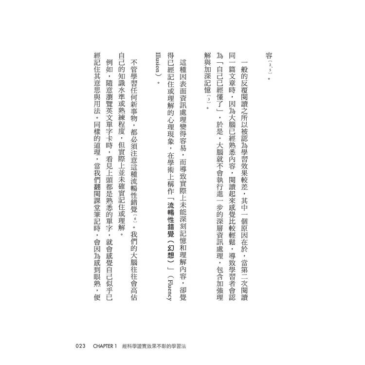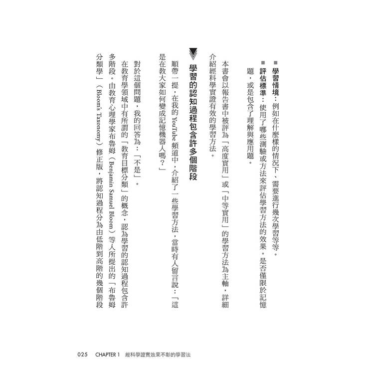 在第1章中,會先介紹那些從科學的角度看來效果不彰的學習方法。我認為,想提高學習效率的話,首先應該知道哪些是效果較差的方法,從而減少花在這些方法上的時間,將節省下來的時間運用在效果更高的學習方法上。