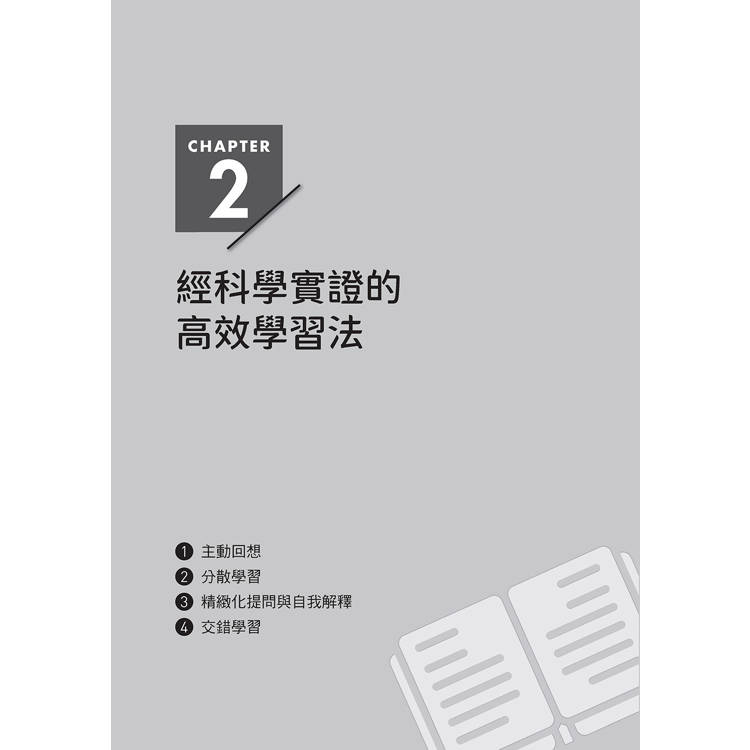 第2章則會詳述那些經科學驗證效率較高的學習方法,並引用一部分代表性的研究論文作為理論基礎,同時具體介紹我在學習時是如何實際運用這些方法。