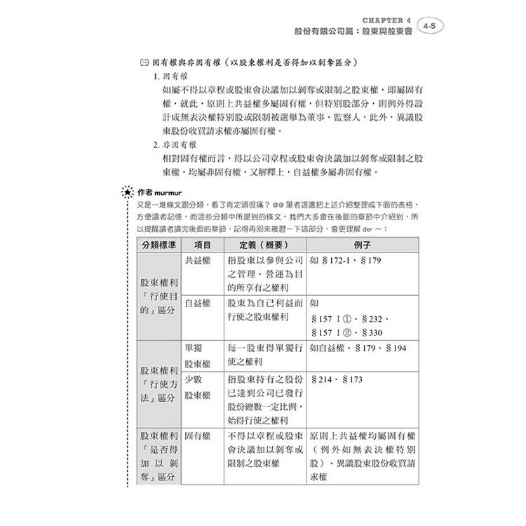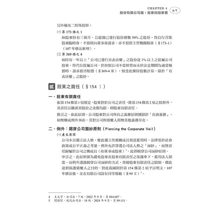 這次的改版,亦增加筆者認為需要再強化的議題,如股東提案權的新近實務見解、表決權拘束契約與經營權協議的相關討論、投保法的新修正與衍生議題等等,期許透過這些補充,這本書可以一次次的成長茁壯,給予讀者更多幫助。