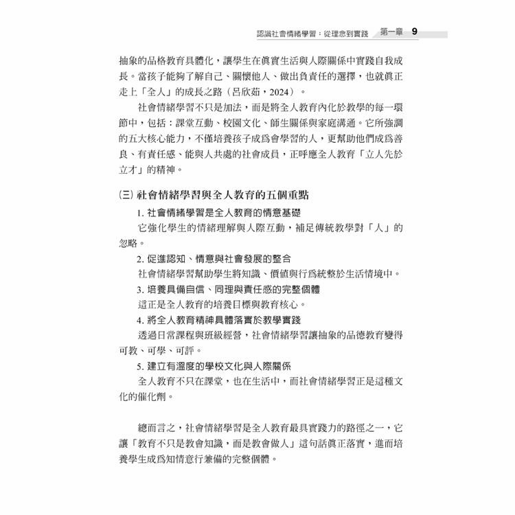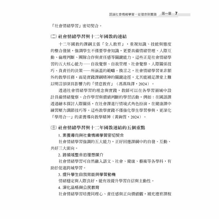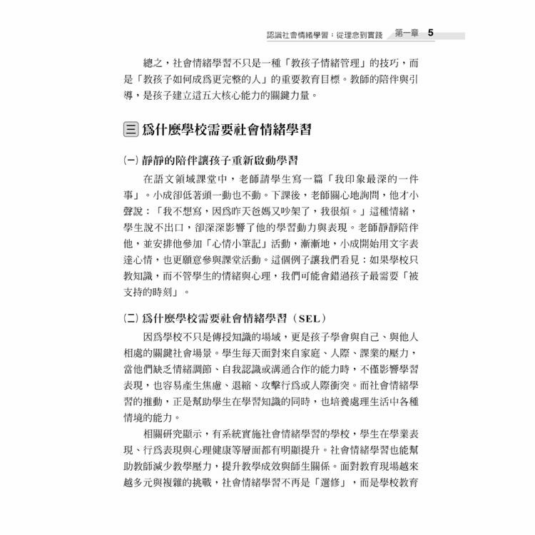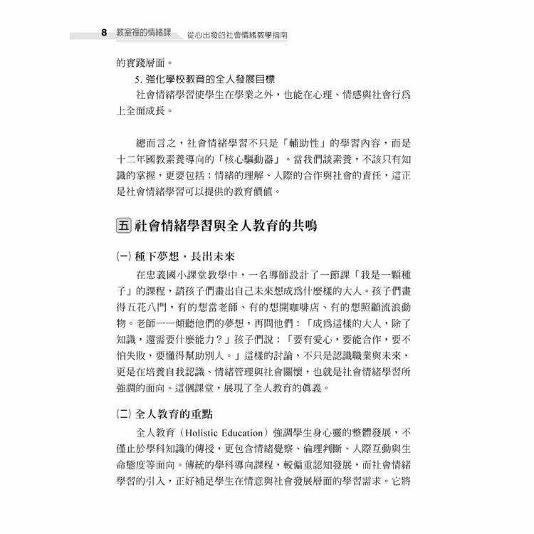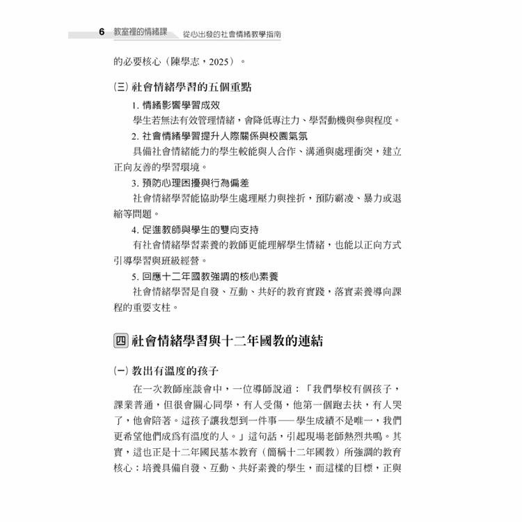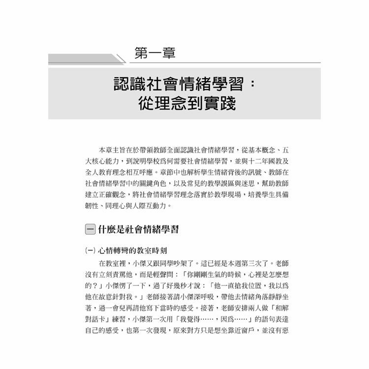 本書強調教師在社會情緒學習推動中的重要角色,結合十二年國教與全人教育精神,支持教師培養學生的情緒調節、同理心與負責決策能力。內容涵蓋家庭合作與特殊學生支持,提供完整的教學指引。透過本書,教師可有效促進學生社會情緒發展,營造安全友善校園,提升學生學習與人際品質,是教師推動社會情緒學習教學的實用寶典。