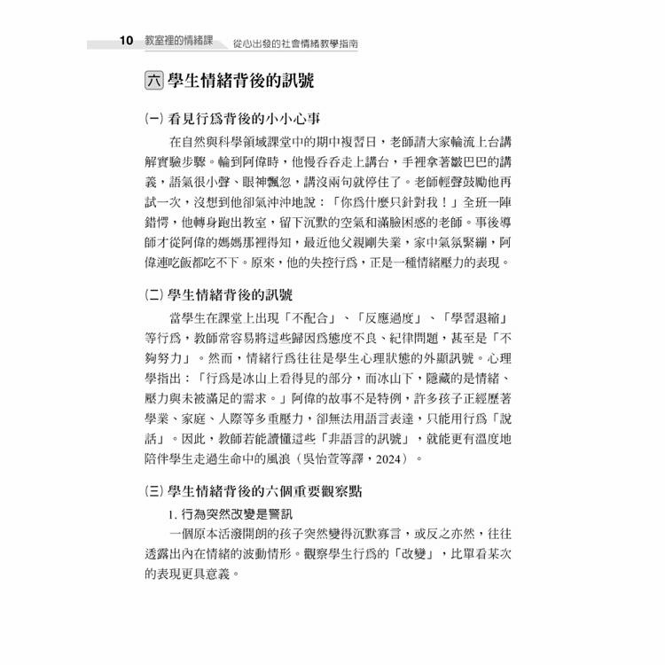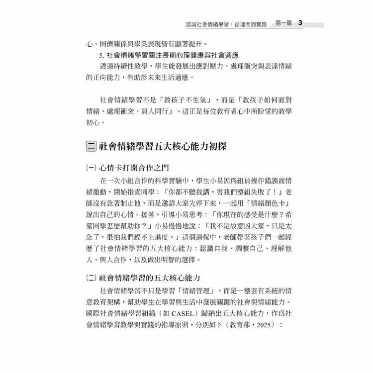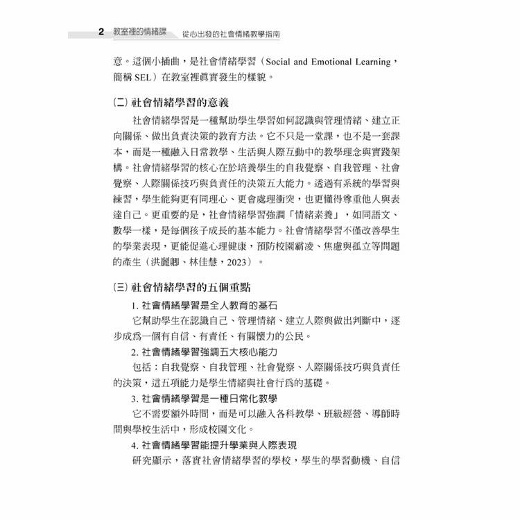 《教室裡的情緒課:從心出發的社會情緒教學指南》結合理論與實務,全面涵蓋社會情緒學習核心理念、自我覺察、情緒管理、社會認知、人際技巧及決策能力。書中設計多元教學策略與活動,如角色扮演、情緒日記、團隊遊戲及數位科技應用,協助教師靈活運用於課堂。